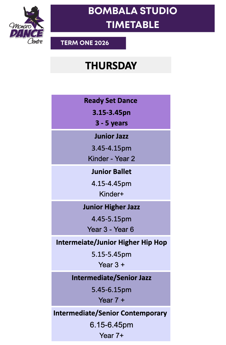 Studio Timetables Classes are held in Cooma & BombalaOur classes are conveniently located in Cooma and Bombala, serving families across the Snowy Monaro region. Please view the timetables below to find the perfect class.